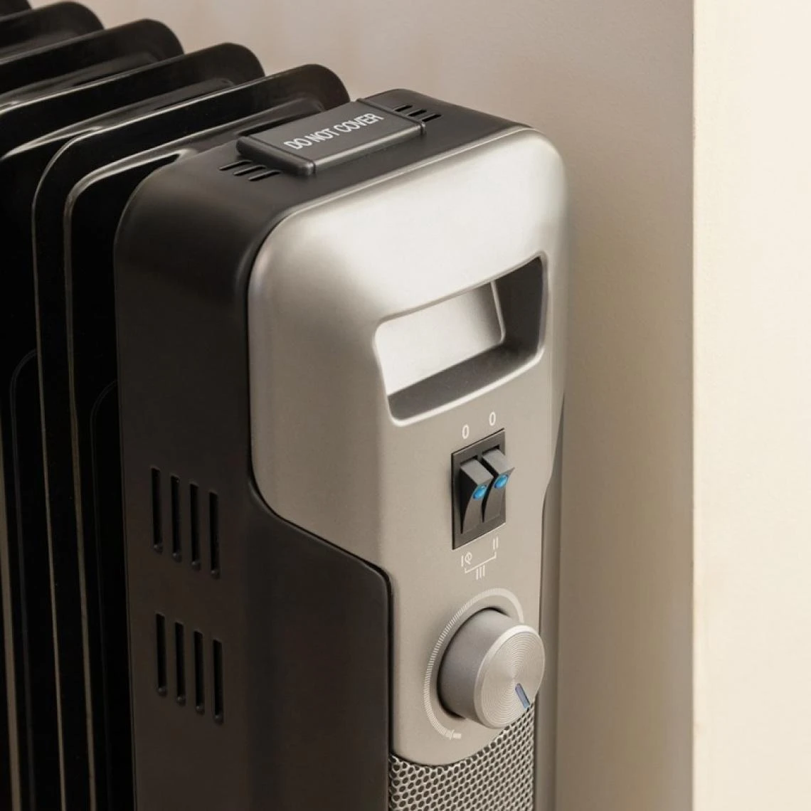 ReadyWarm 9000 Space Black Radiateur bain d’huile avec 9 éléments, 2000 W et 3 niveaux de puissance. Radiateur bain d’huile avec 9 éléments de 150 x 580 mm. Conçu pour des pièces et de petites salles. 2000 W de puissance. Il réchauffe rapidement la pièce dans laquelle il est installé. Sa technologie WarmSpace est capable de réchauffer jusqu’à 20 m² efficacement. Thermostat ajustable avec trois niveaux de puissance pour optimiser la consommation d’énergie : puissance minimale de 800 W (Eco), moyenne de 1200 W et maximale de 2000 W. Ramasse-câbles inclus pour ranger le câble et éviter de trébucher. Il est très facile à utiliser car il ne possède qu’un sélecteur pour régler le thermostat et deux boutons pour sélectionner le mode de fonctionnement. Système EasyGo pour un transport facile. Il possède une poignée ergonomique et des roues multidirectionnelles pour pouvoir le déplacer facilement. Le radiateur dispose de deux systèmes de sécurité : un contre la surchauffe, l’Overprotect System et le système AutoOff, qui arrête l’appareil automatiquement en cas d’excès de chaleur.