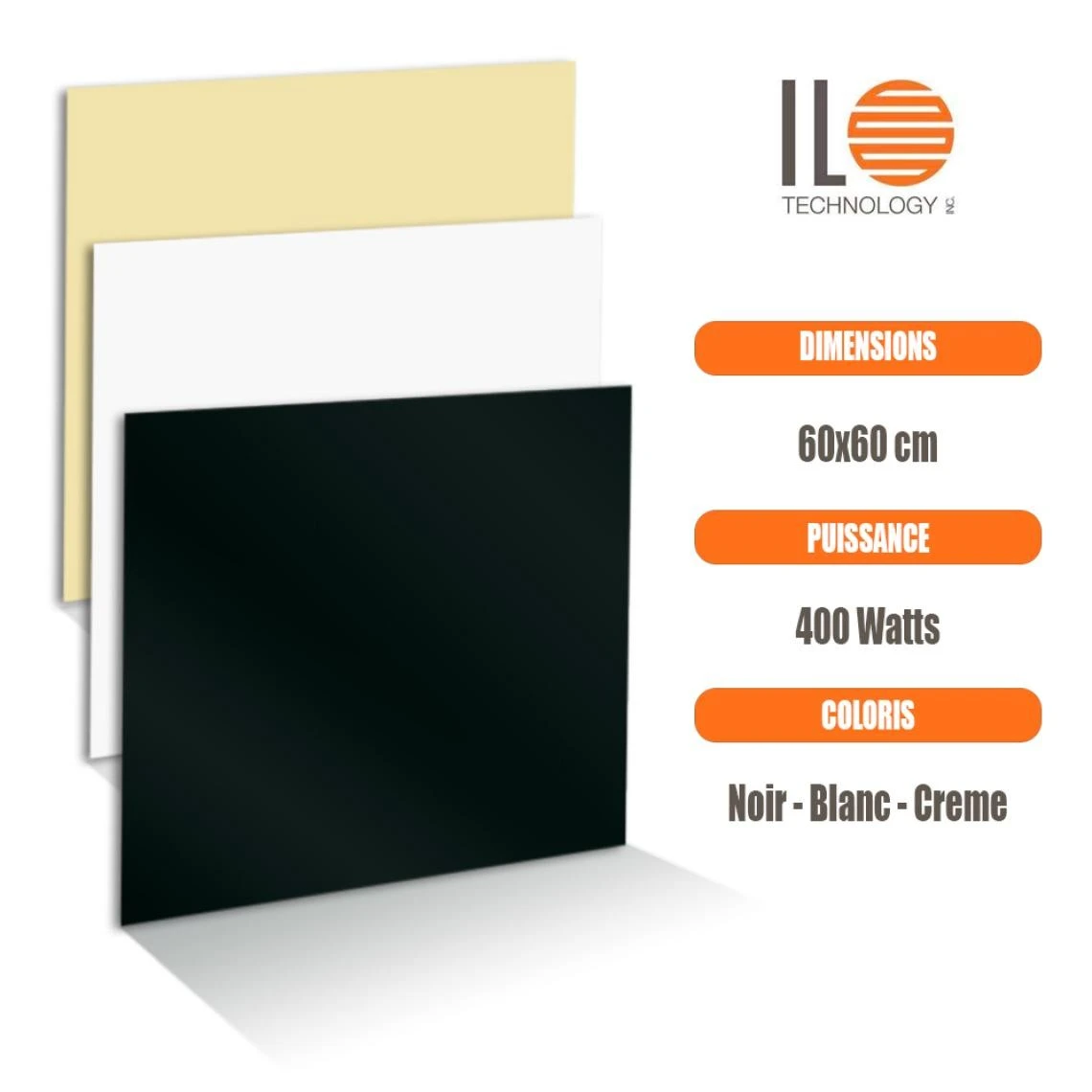 Radiateur électrique à rayonnement extra plat 400W 600x600mm – ILO Technology. Laissez vous séduire par ce radiateur ILO extra plat combinant à la fois la discrétion et le désign d’un élémént de décoration. CARACTERISTIQUES TECHNIQUES : . – Type de produit : Radiateur électrique mural. – Marque : ILO Technology. – Modèle : GLAS-C. – Matière : Céramique. – Coloris : SANS thermostat : noir, crème, blanc AVEC Thermostat : noir. – Dimensions : 60×60 cm. – Puissance électrique : 400 Watts. – Surface à traiter : 9 m2. – Type de chauffe : Rayonnant. – Élément chauffant : Film chauffant rayonnant. – Tension : 240 Volts. – Fixations : Support mural en croix. – Certifications et normes : IP44. – Fabrication française. CE QUE NOUS AIMONS :. Bénéficiez d’un confort thermique optimal grâce à la technologie de chauffage par rayonnement de ce radiateur ILO. En effet le ce radiateur électrique vous assurera une montée en température rapide et une chaleur douce, naturelle et diffuse dans votre pièce. Ce radiateur fait aussi office d’objet déco et s’intègrera parfaitement dans toutes les pièces de votre intérieur. Ce chauffage ne brasse pas d’air et ne carbonise pas de poussière pour vous assurer une qualité d air intérieur toujours optimale. Cet émetteur de chauffage mural joue la carte de la discrétion de par son ultra compacité et son silence de fonctionnement. L’installation de votre radiateur est facile et rapide grâce à son systeme de fixation unique. Et cocorico ! Ce panneau en verre radiant est un pur produit de fabrication française.