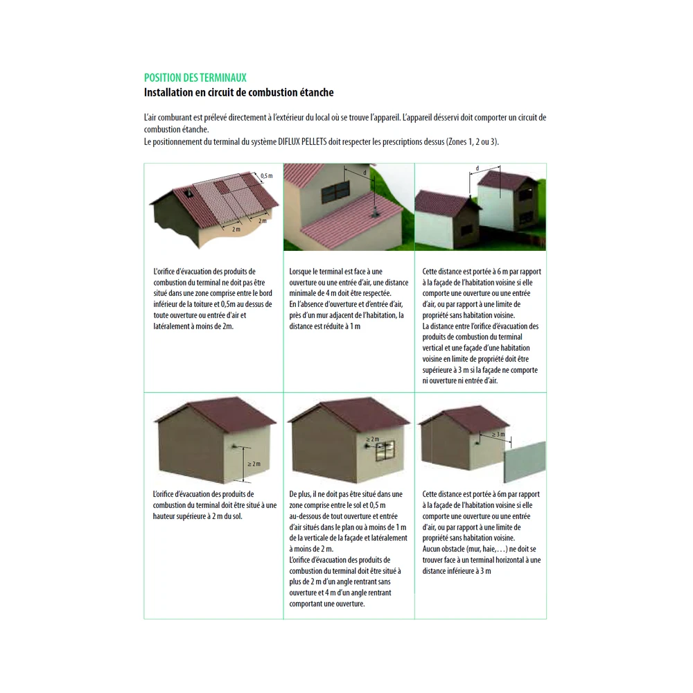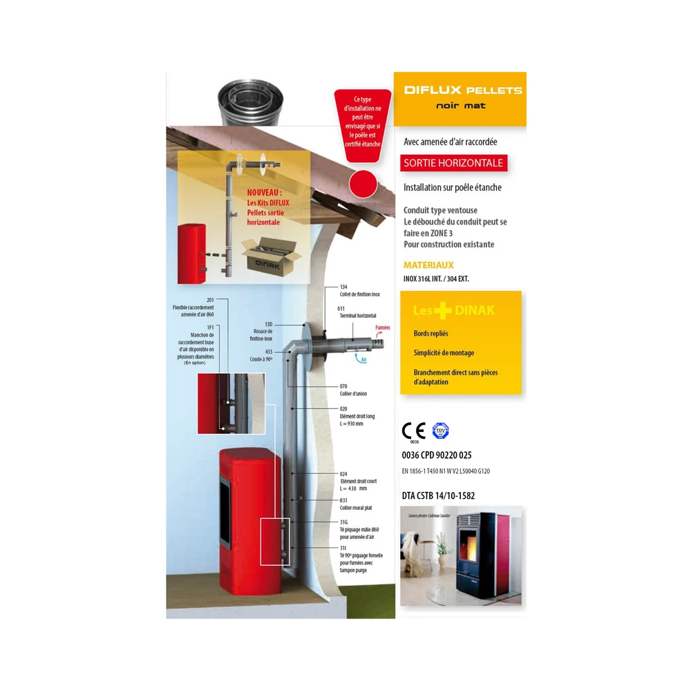 LE KIT SORTIE VENTOUSE EST COMPOSE DE : 1 x Té fumées piquage femelle Ø80 avec tampon démontable pour faciliter le ramonage (Montage directement sur la sortie fumées mâle du poêle, sans pièce d’adaptation veiller que votre poêle est bien équipé d’une sortie mâle / 1 x Té prise d’air Ø60 mâle (Raccordement direct à la prise d’air du poêle Ø60 grâce au flexible d’amenée d’air fourni vérifier le diamètre d’amenée d’air de votre poêle). / 1 x Flexible d’amenée d’air Ø60. / 1 x Elément droit (930mm) + 1 x élément droit moyen (430mm). / 1 x Fixation murale réglable (Déport réglable de 70 à 140mm). / 1 x Coude 90°. / 2 x Rosaces de finition intérieure et extérieure : FINITIONS PARFAITES du percement. / 1 x Terminal horizontal réglable : S’adapte à l’épaisseur de votre mur (Il permet l’évacuation des gaz brulés et la prise d’air frais) / Colliers d’union et joints. LES ATOUTS DINAK : Qualité de fabrication professionnelle (Soudures laser, inox 316L/304) – Finition de sécurité des bords anti-coupure – Laquage noir mat RAL 9005 TXT ANTI RAYURES – Certifié CE et détenteur du DTA CSTB – Diamètres standards 80/125 – Compatible avec la grande majorité des poêles du marché sans adaptateurs – Bords repliés – Simplicité de montage. DONNES TECHNIQUES : Matériau de la paroi intérieure :Inox 316L / Epaisseur de la paroi intérieure : 0,4mm / Diamètre intérieur : 80mm / Matériau de la paroi extérieure : Inox 304 / Epaisseur de la paroi extérieure : 0,4mm / Finition de la paroi extérieure : Laquage noir mat RAL 9005 TXT anti rayure / Diamètre extérieur : 125mm / Emboitement : 50mm / Diamètre de la prise d’air (mâle) : 60 / Diamètre de la prise fumée (femelle) : 80 / Température d’utilisation max : 450°C. LES AVANTAGES D’UN MONTAGE ETANCHE : Fonctionnement du poêle indépendant de l’air ambiant (Obligatoire pour les maisons BBC) – Installation simplifiée avec un nombre d’éléments réduits (Inutile d’avoir un conduit existant) -Température de surface du conduit réduite grâce à la lame d’air frais – Règles de débouchées simplifiée par rapport à une installation non étanche. Le débouché du conduit type ventouse peut se faire en ZONE 3 (Pour construction existante).